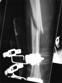 Fracture du 1/3 central du tibia, par accident de ski (la chaussure